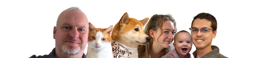 Ons ben ik zelf, mijn dochter Alycia (hier samen op de foto van een paar jaartjes geleden), Boxy de kater, Chino de hond, Jeffrey de schoonzoon, en,.....